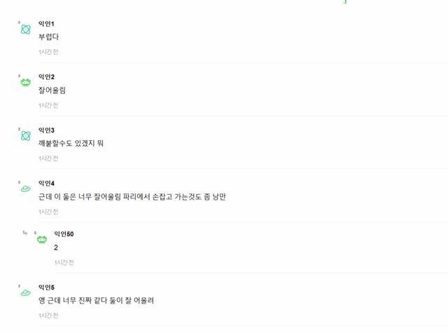 “我好酸”; “很般配啊”; “觉得他们在一起也挺好的”; “这两位真的超配!在巴黎牵手也太浪漫了”; “附议^”; “确实很有真情侣的氛围呢 很相配”……